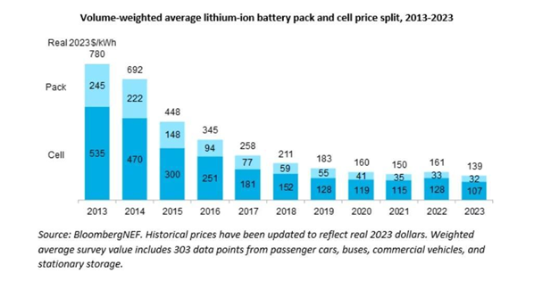 According to BloombergNEF’s annual battery price survey finds a 14% drop from 2022 to 2023, the price of lithium-ion battery packs has dropped 14% to a record low of $139/kWh, according to analysis by research provider BloombergNEF (BNEF). This was driven by raw material and component prices falling as production capacity increased across all parts of the battery value chain, while demand growth fell short of some industry expectations. Battery demand across electric vehicles and stationary energy storage is still on track to grow at a remarkable pace of 53% year-on-year, reaching 950 gigawatt-hours in 2023. Despite this growth, major battery manufacturers reported lower utilization rates for their plants, while demand and revenue fell short of many companies’ expectations. As a result, many EV and battery makers revisited their production targets, which in turn impacted battery prices. Lithium prices reached a high point at the end of 2022, but fears that prices would remain high have largely subsided since then and prices are now falling again.